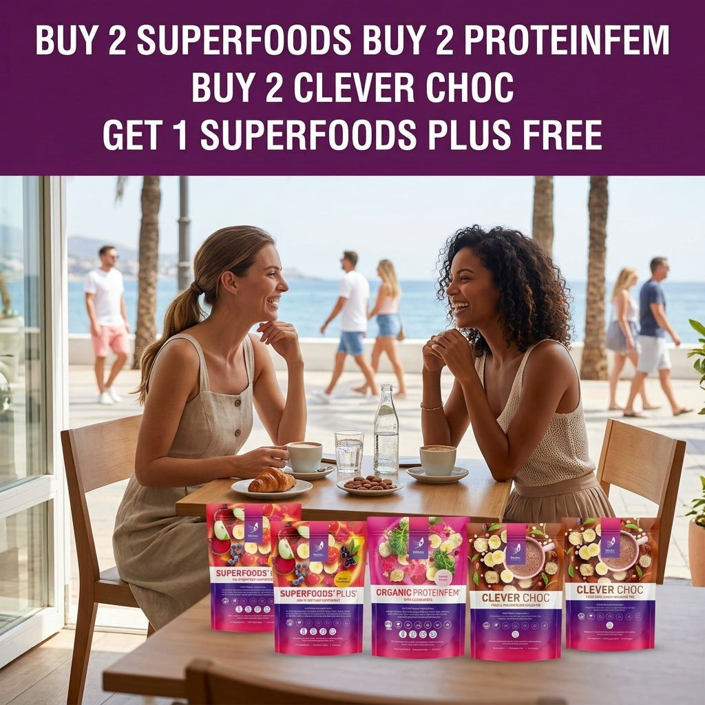 Limited time offer – Buy 2 pouches of Superfoods Plus, 2 pouches of ProteinFem and 2 pouches of Clever Choc and get one extra pouch of Superfoods Plus completely free of charge.